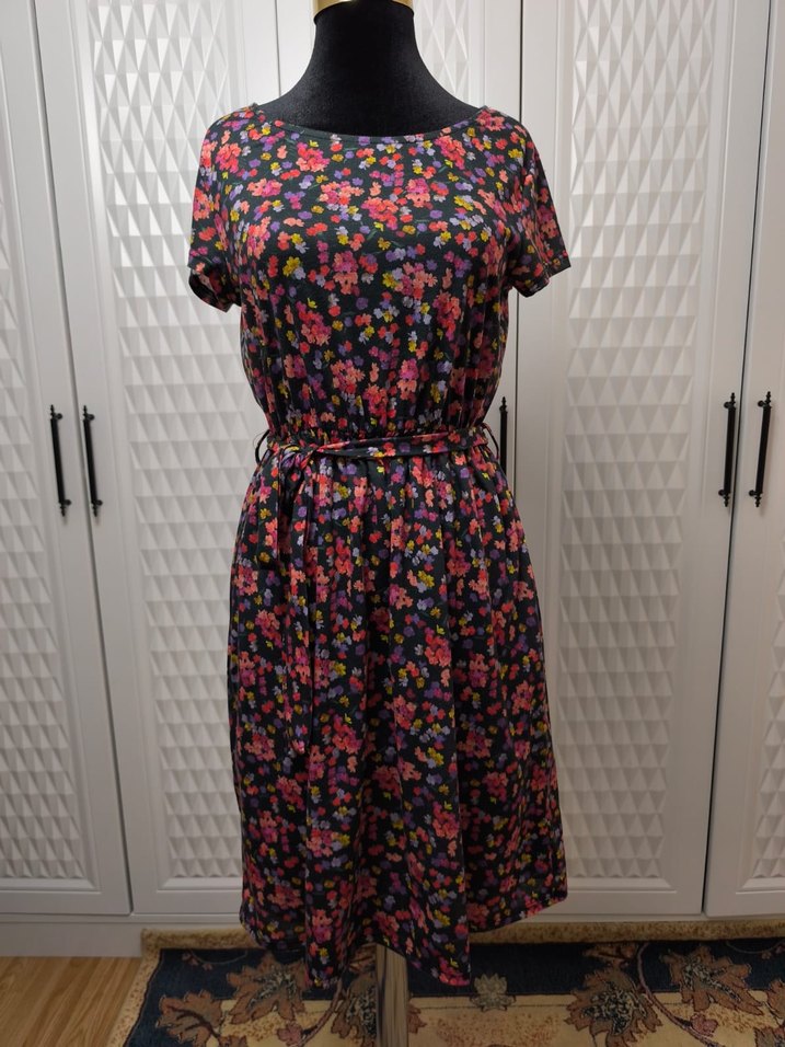 Renkli çiçek desenli, kısa kollu ve yuvarlak yakalı bol kesim midi elbise. Kemerli bel detayı ve yumuşak sentetik kumaştan üretilmiştir. Günlük kullanım için uygun bohem tarzı.