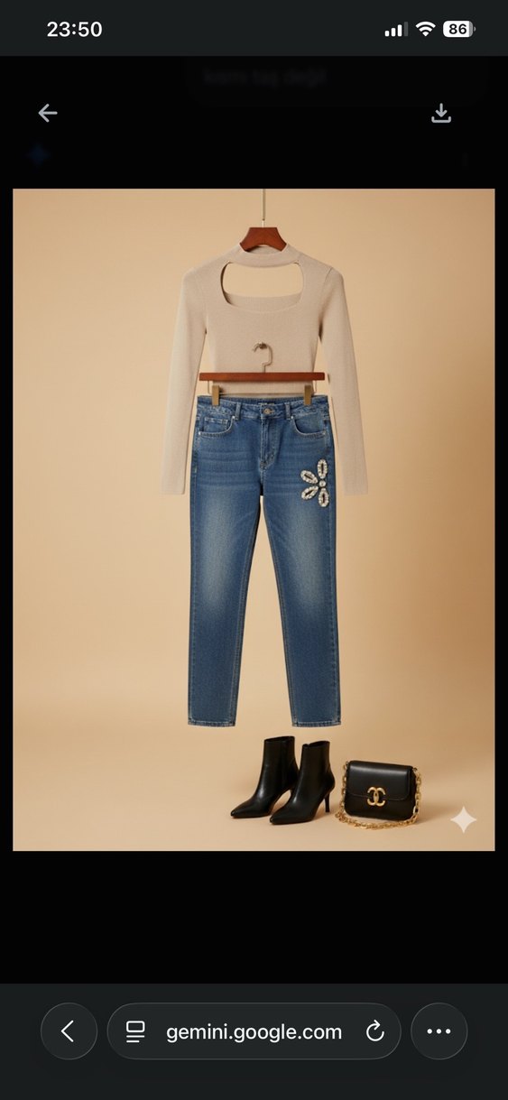 Dese. işlemeli, kemerli, bol kesim midi uzunlukta kot pantolon. Sokak modasına uygun açık bej renkte.