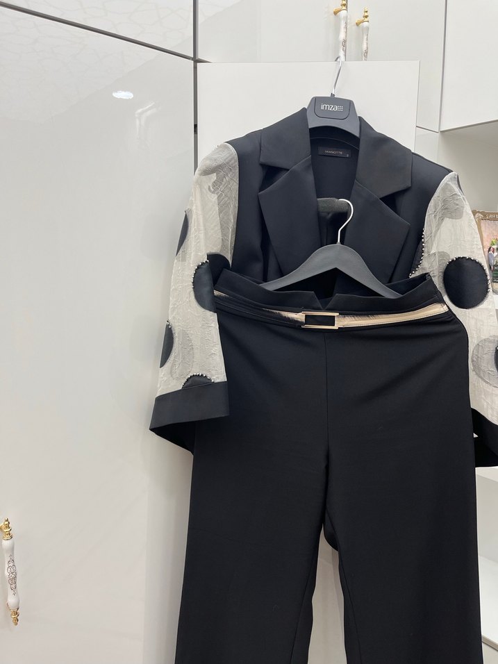 Kemerli, desenli kolları olan siyah kadın takımı. Kısa boy, regular fit, kesik yaka ve askılı kollu. Sentetik kumaştan, ofis için uygun şık tasarım.