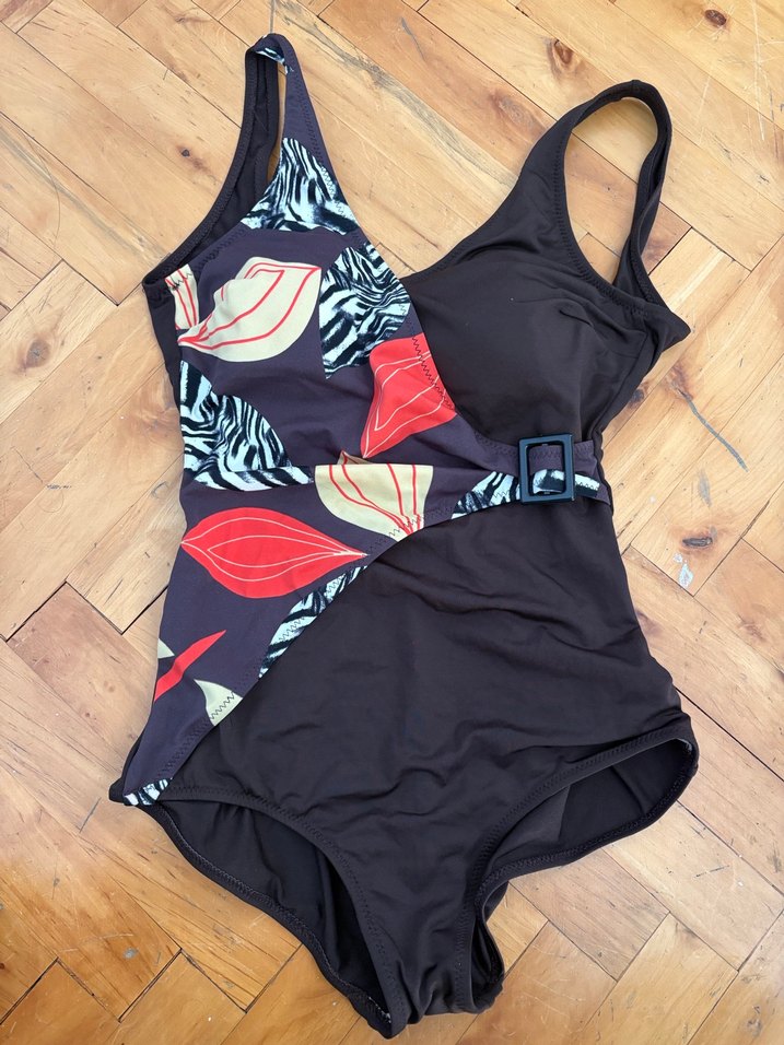 Siyah renkli, kemerli ve desenli detaylara sahip, kısa kesim ve ince askılı kadın mayo. NBB marka. Dolapta duruyor hiç giyilmedi