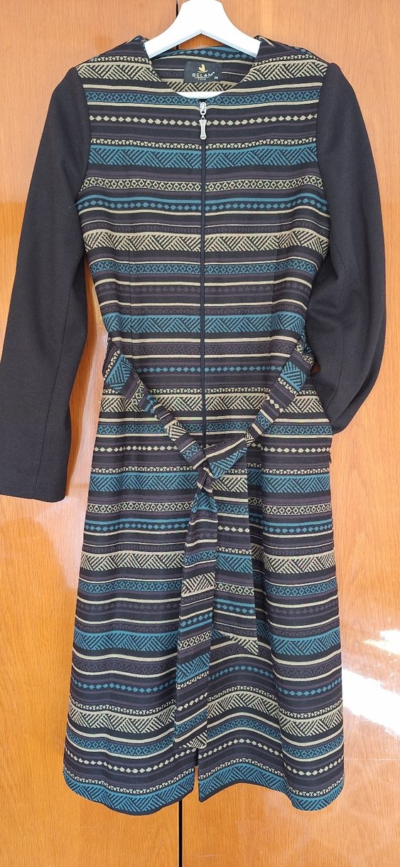 Uzun kesim, desenli ve kemerli bel detayına sahip kaban. Bohem tarzı ve günlük kullanım için uygundur.