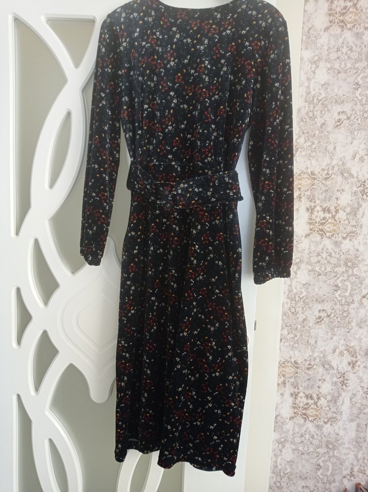 Yumuşak kadife kumaştan, yüksek yakalı, kemerli ve desenli uzun kollu, vücuda oturan lacivert çok renkli bohem elbise.#kadınelbise #elbise #dışgiyim #kadın #kadife
