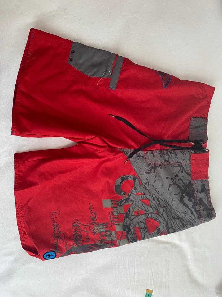 desenli kırmızı ve gri renklerde, rahat kesim erkek mayo.
