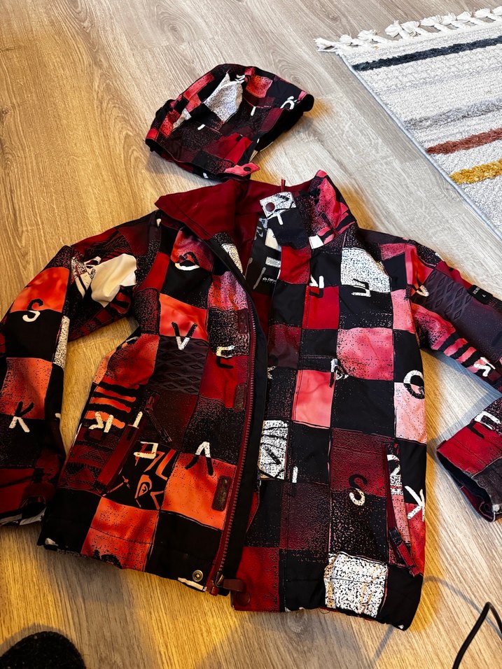 Desenli kırmızı kapüşonlu hamile mont, bol kesim ve uzun kolludur. Fermuarlı ve yumuşak, rahat kumaştan üretilmiştir. Günlük kullanım için uygundur. Kol detaylarındaki aşınmalar dışında bir kusuru yoktur