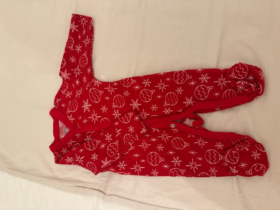 Renkli desenlere sahip, çıt çıtlı ve bisiklet yaka kırmızı kız bebek tulumu. Yılbaşı konseptli
