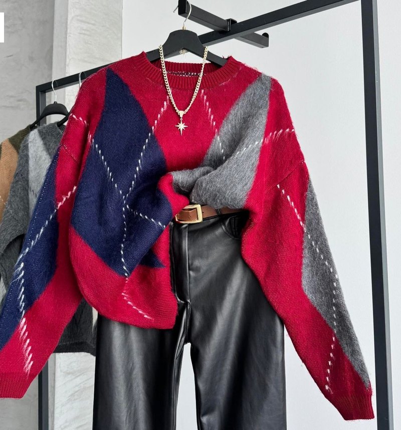 Desenli, koyu kırmızı renkli, örgü kumaştan yapılmış, salaş kesim ve yuvarlak yaka kazak. Butikten.