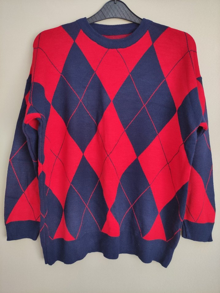 Renkli desenli örme kadın kazak,. ekose'nin en güzel hali yeni kalın esnek .üniseks kullanılabilir kadında XL erkek için L beden uygundur harika tarzlar oluşturulabilir. sezon çok moda. boyu 68 kol alttan eni 61.. düşük kol kol boyu 48