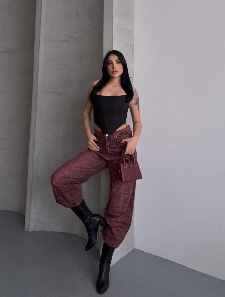 Desenli Kırmızı Wide Leg Pantolon Lovenay.co L Beden