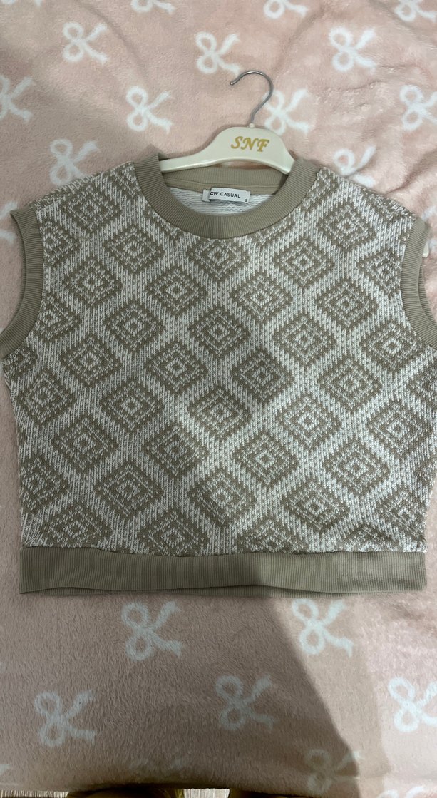 Yuvarlak yaka, kolsuz, gevşek kesim, kısa boy bej ve gri desenli örme süveter. Rahat ve trend sokak tarzı için uygundur. Askıda 'SNF' yazıyor.