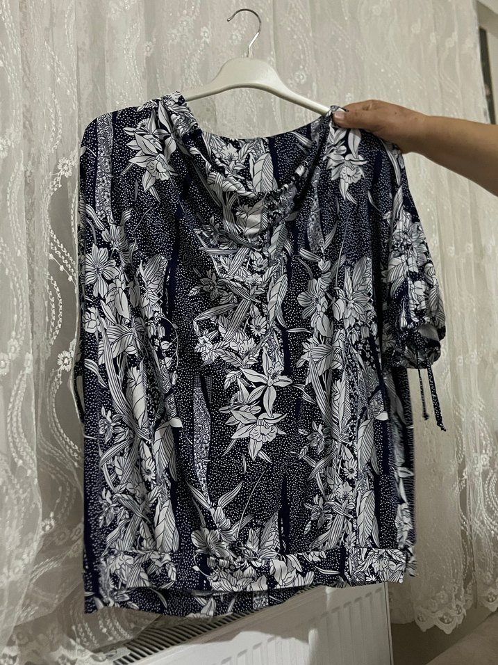 Bohem tarz gri çiçek desenli, kısa kollu, yüksek yakalı ve bol kesim kısa bluz. Drapeli detay içerir.