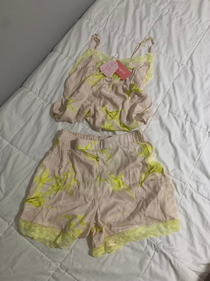 Pastel desenli, kısa ve ip askılı, bol kesim pijama takımı, dantel detaylarıyla rahat ve konforlu.
