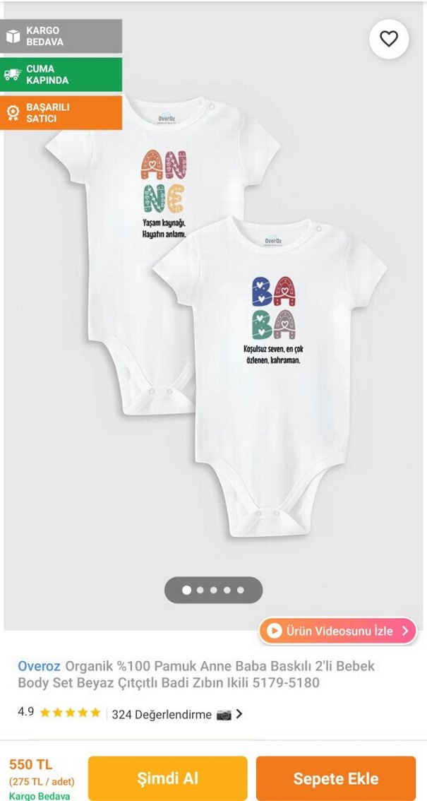 Kısa kollu, yuvarlak yakalı bebek bodyleri, renkli baskılar ve anlamlı Türkçe yazılar içerir. Yumuşak kumaştan üretilmiştir. Bir tanesinin zıbın citcitin ufak bir delik var. fotoğraflara ekledim. onun dışında temiz ürünler.
