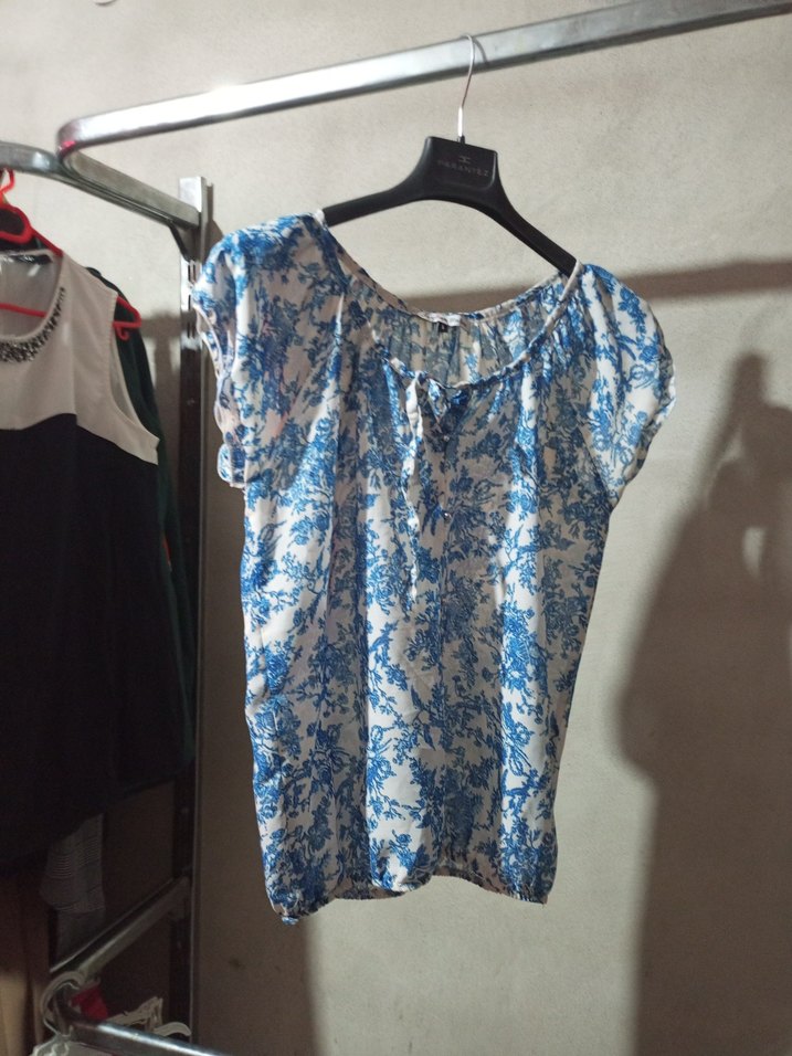 kısa kollu, v yaka ve drapeli tasarıma sahip, açık mavi bağlama desenli