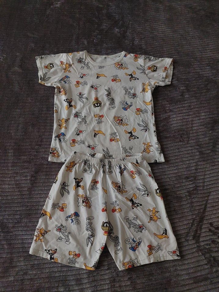 beyaz zemin üzerine renkli çizgi film desenli, kısa kollu ve yuvarlak yaka, bol kesim pijama takımı. Üst ve şorttan oluşur, rahat kullanım sağlar.