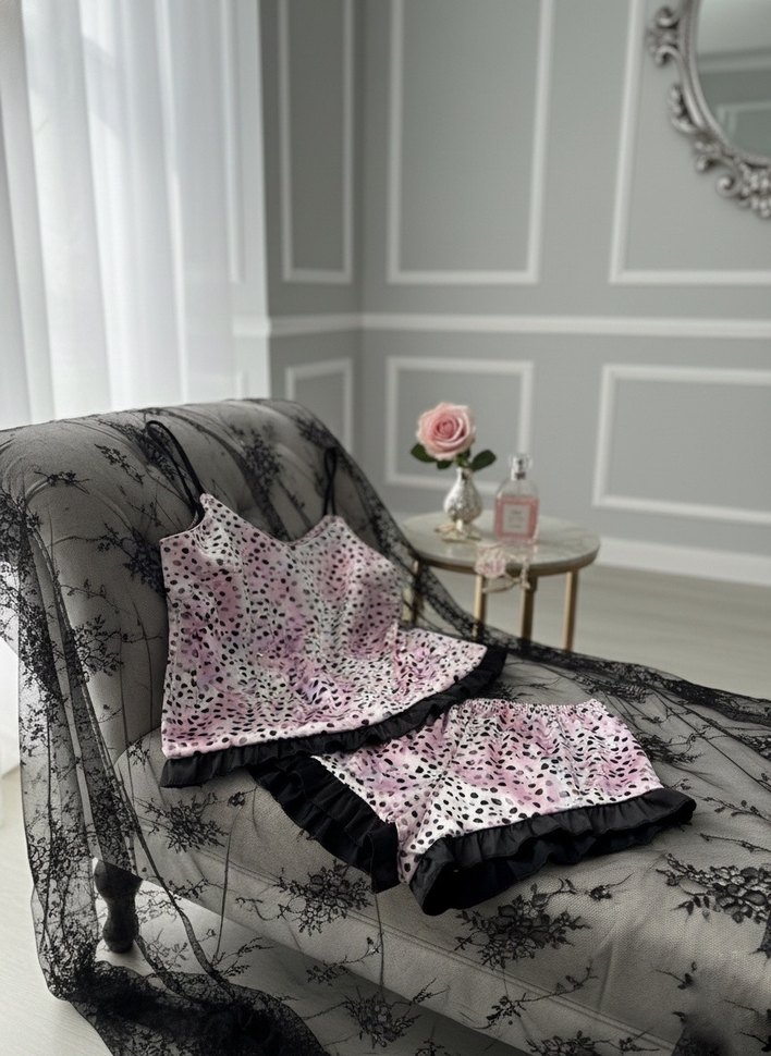 Kadın pijama takımı, ince askılı, kısa ve bol kesimdir. Koyu pembe, desenli ve siyah fırfır detaylı, çağdaş ve rahat bir tarza sahiptir.
