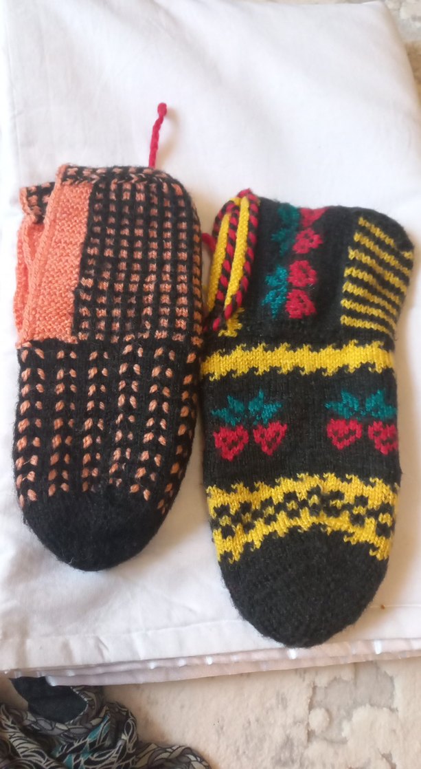 Kız çocukları için çok renkli, koyu tonlarda örgü desenli çoraplar. Çilek ve çizgili canlı desenler içerir. Tane hesabidir