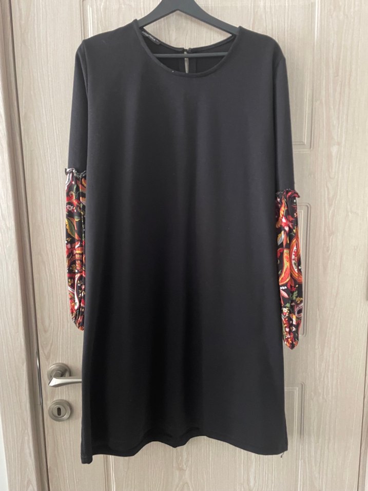 Siyah tunik, uzun kollarda renkli desenli drapeli detay, bol kesim ve yuvarlak yaka ile bohem tarzı sunar.