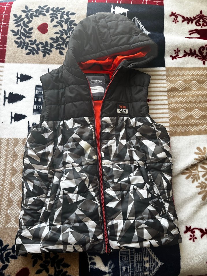 Koyu gri renkli, desenli ve kapüşonlu erkek çocuk yeleği. Yüksek yakalı, fermuarlı ve yumuşak, sıcak tutan kumaştan üretilmiştir.
