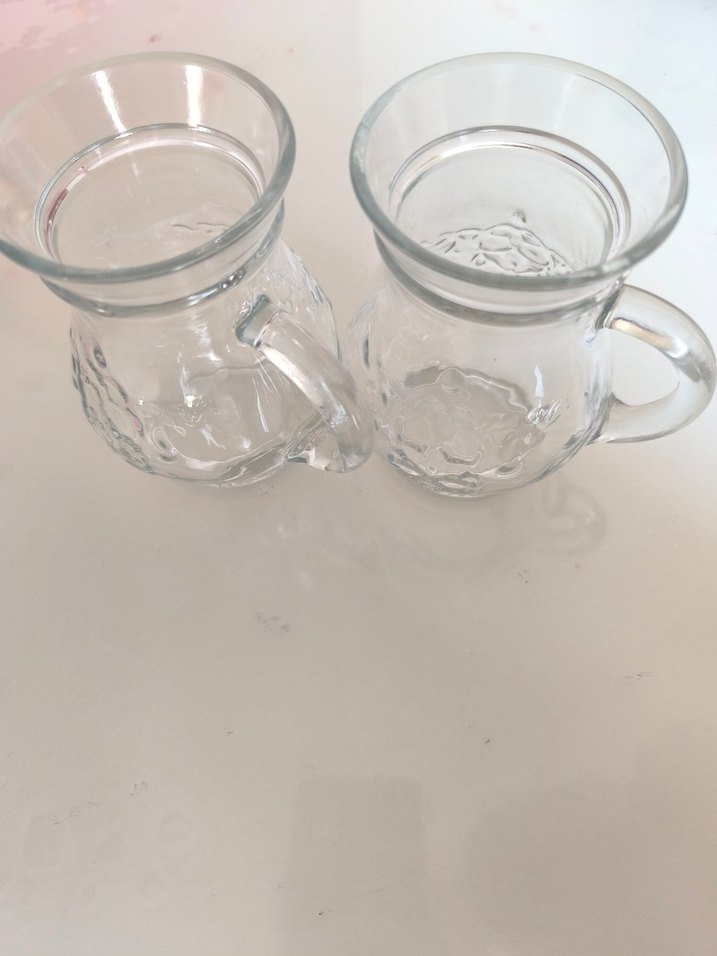 Kulplu, desenli camdan yapılmış iki bardak seti, içecek servisinde kullanılabilir.