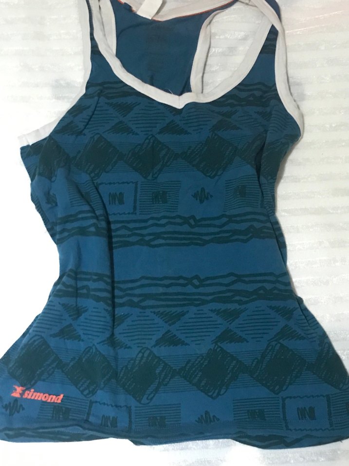 V yakalı, baskılı ve koyu mavi tonlarda desenli, vücuda oturan kolsuz atlet. Yumuşak sentetik kumaştan, örme detaylıdır. Esimond markası baskılıdır.