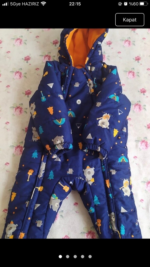 Desenli lacivert bebek kayak tulumu, fermuarlı ve yumuşak sıcak astarlıdır. Kapüşonlu ve lastikli manşetlidir. Omuzdan topuğa 70 cm