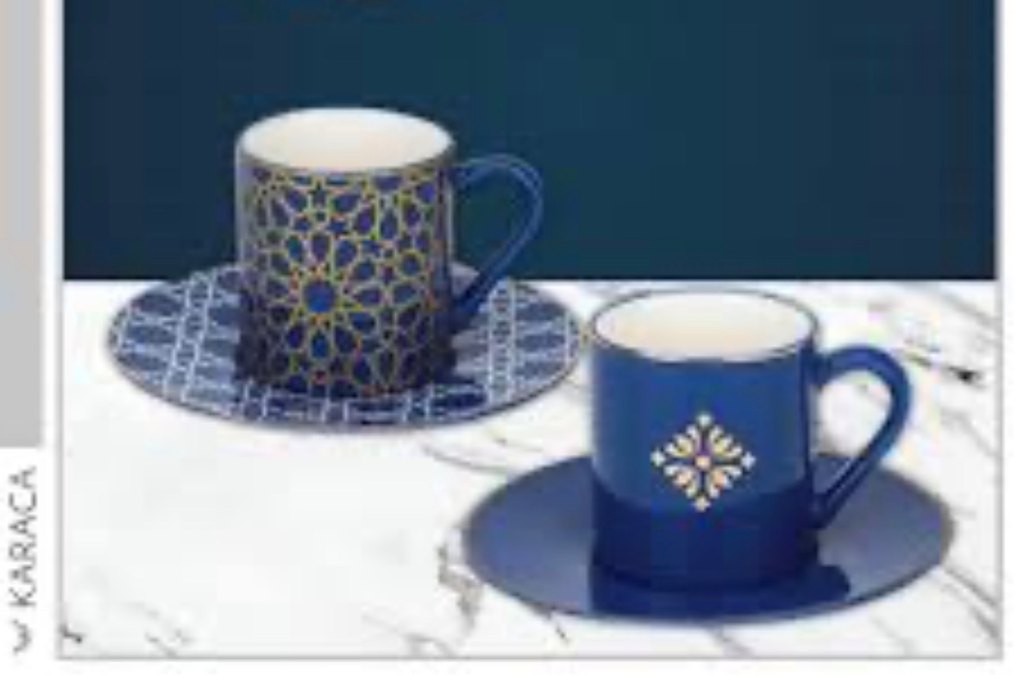 İki adet lacivert seramik kahve fincanı, altın ve beyaz geometrik desenlerle süslenmiş, Türk kahvesi servisi için uygun. ☕