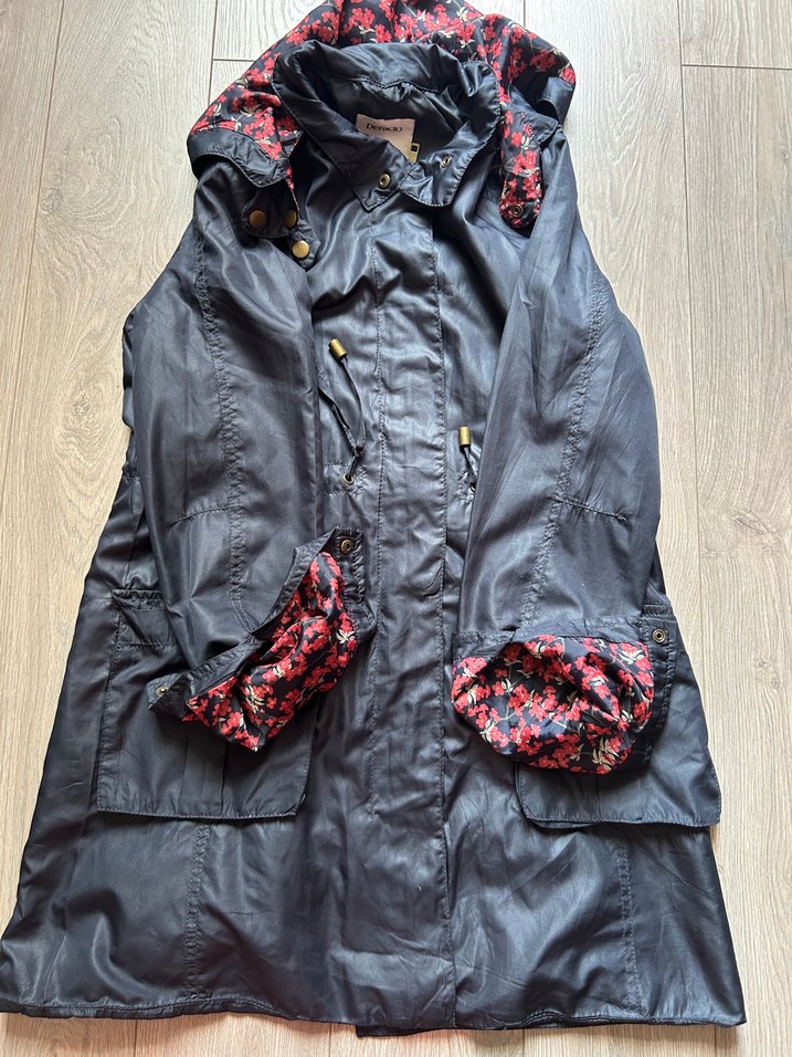 Düğmeli önü ve kesimli yakası olan uzun lacivert ,. Rahat kesimli ve desenli astarlı, sokak stili için uygun.