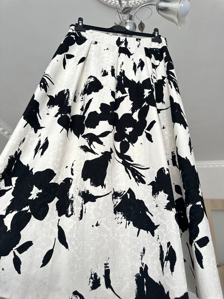 Siyah beyaz desenli, pilili ve bol kesim kısa hamile eteği, günlük sokak stili için uygun.