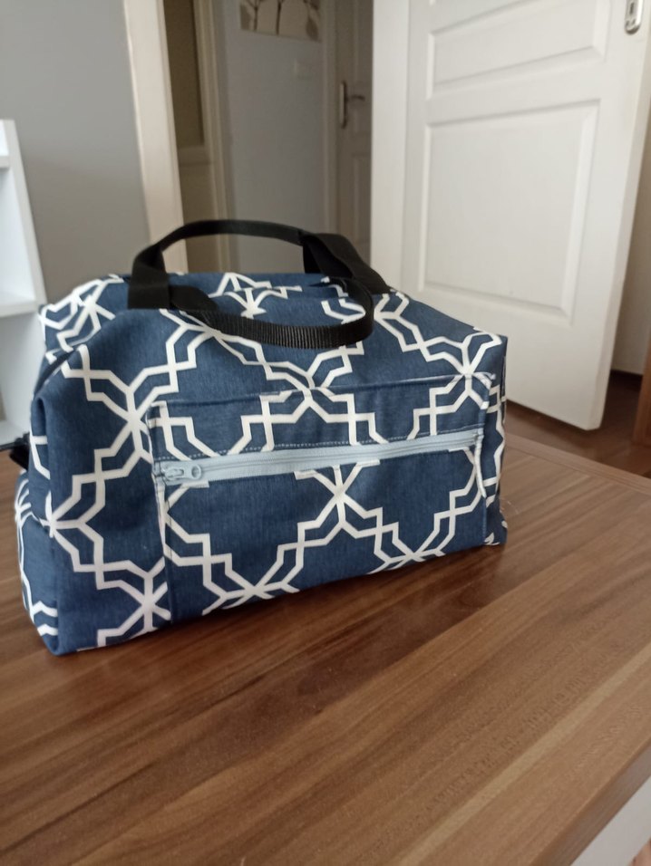 Mavi ve gri tonlarda, önünde fermuarlı cep ve siyah kulpları olan desenli bebek çantası. Temel eşyalar için kompakt ve kullanışlı.