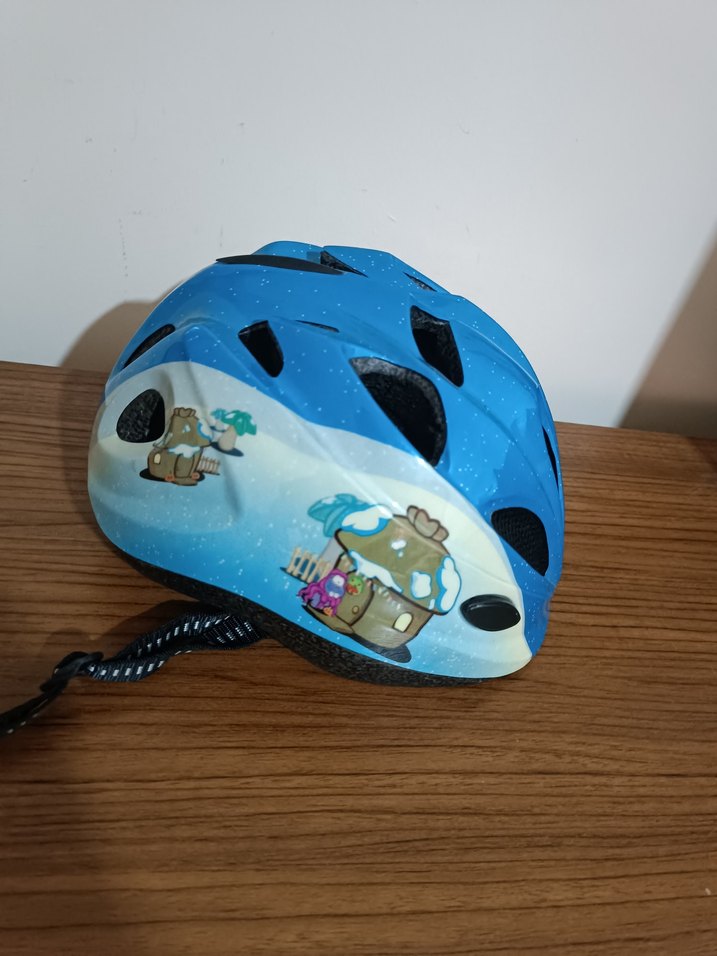 Mavi bisiklet kaskı, desenli renkli baskı, tokalı kayış ve bohem ve retro tarzı sunar.