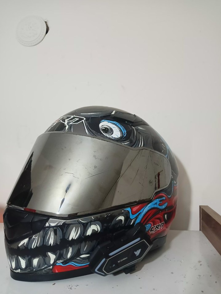 Koyu mavi desenli biker kask, tokalı ve seramik malzemeden üretilmiştir, rock punk havası taşır. ️