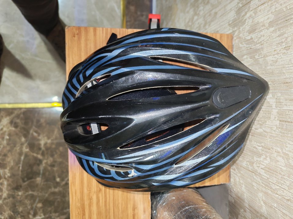 Desenli, koyu mavi renkte, kemerli bisiklet kaskı. Plastik malzemeden üretilmiş, avant-garde ve moda tutkunları için uygun