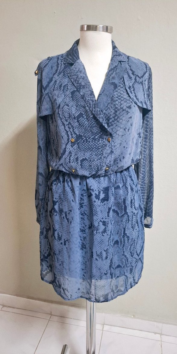 Desenli mavi şifon kadın elbisesi, ofis için uygun.