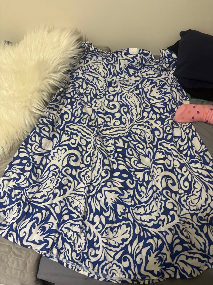 Bu hamile eteği, desenli koyu mavi sentetik kumaş ve drapeli yapısıyla rahat bohem tarz sunar, günlük kullanıma uygundur.