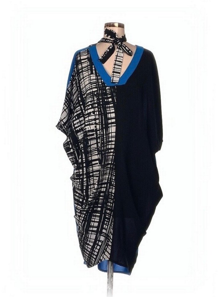 Desenli, mavi renkli, drapeli ve bol kesim uzun tuniği. V yaka ve ince askılı kollara sahiptir. Günlük kullanıma uygundur. Göğüs 70 cm, boy 102 cm. M-L uyumlu.