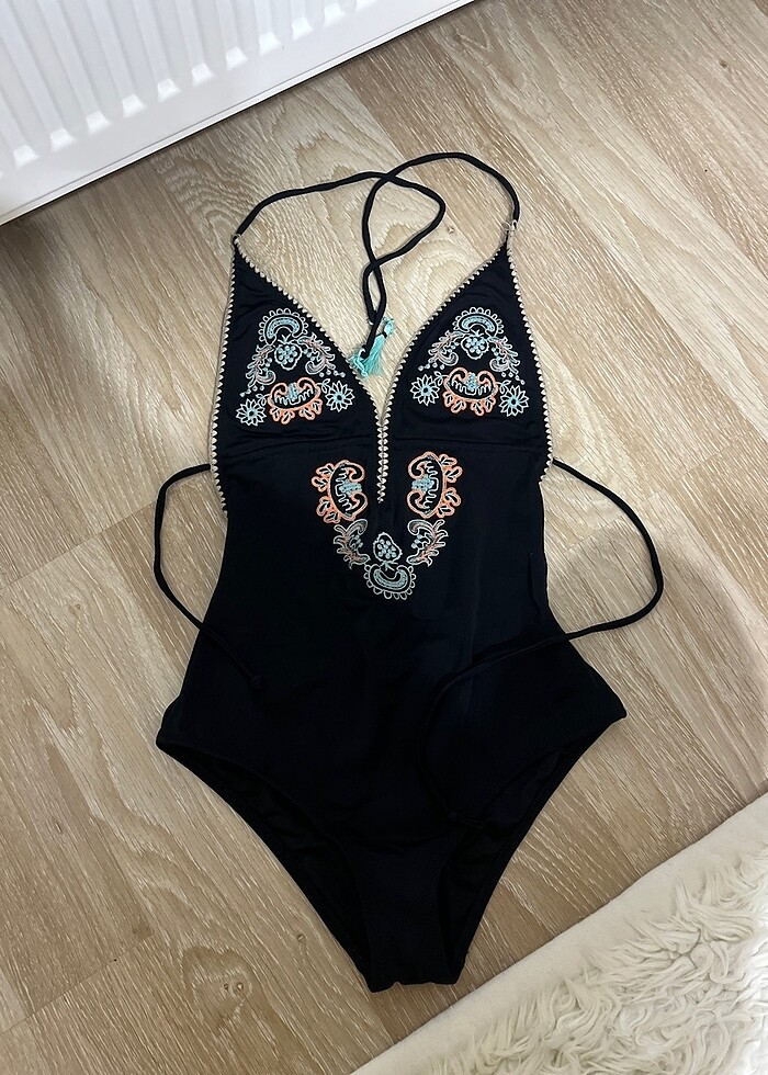 Desenli siyah mayo likralı ve pedli. 36 beden yazıyor fakat kalıbı küçük 32-34 bedenler tercih edebilir