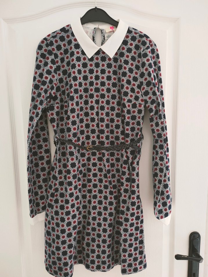 Desenli midi elbise, uzun kollu ve yakalıdır. Bel detaylı ve vücuda oturan kesime sahiptir. Yumuşak sentetik kumaştan üretilmiştir.