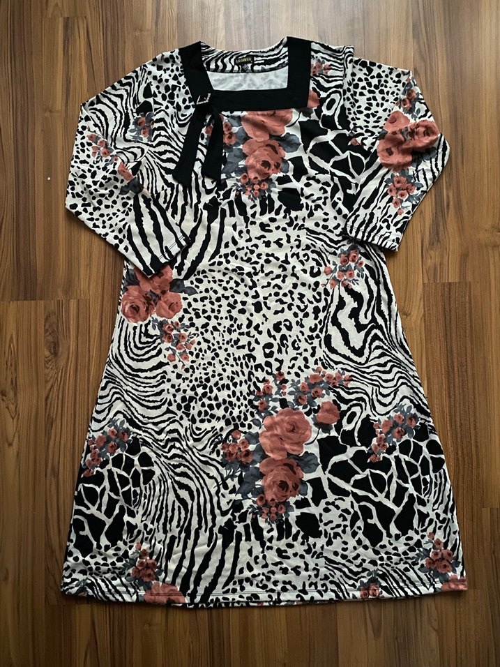 Uzun kollu, yuvarlak yaka, zebra ve leopar çiçek desenli, yaka kısmı taşlı elbise.
