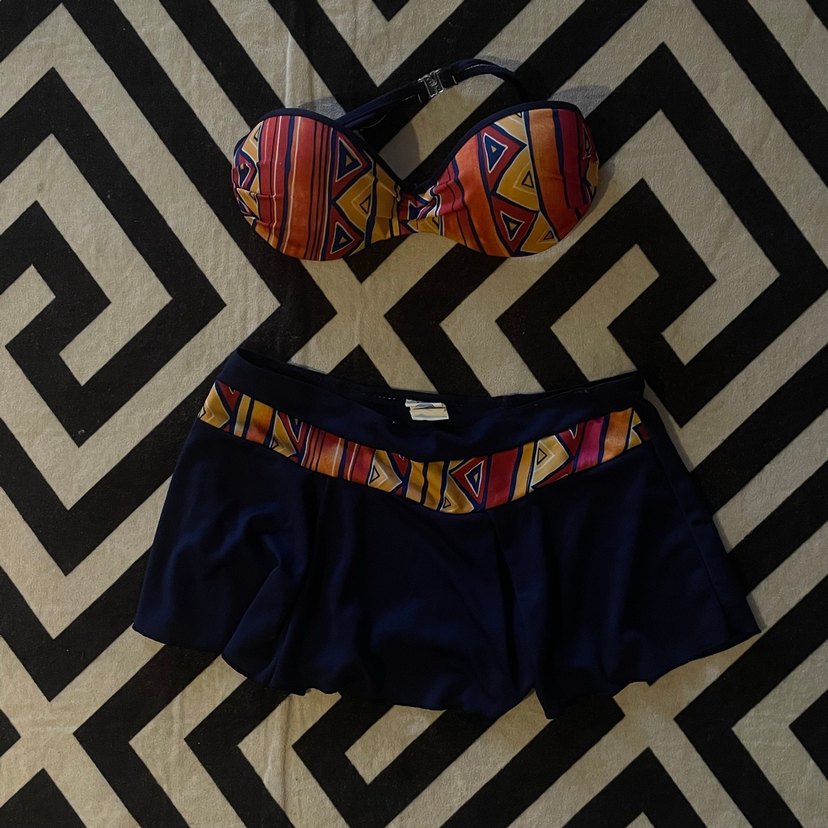 Bohem tarzda, desenli ve askılı üst ile kemerli mini etekten oluşan, koyu çok renkli bikini takımı.