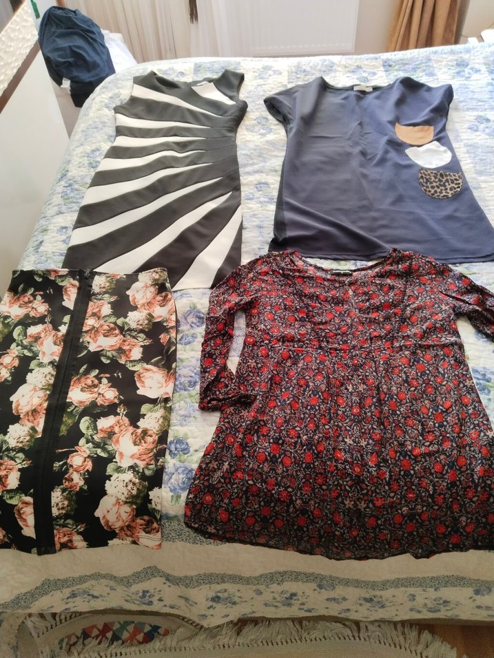 Drapeli, straplez yaka ve kısa kollu, bol kesim mini elbise. Yumuşak kumaştan, koyu renkli çok renkli desenli, günlük bohem tarzda rahat elbise.