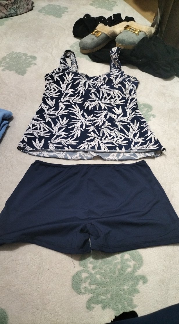 Kadın mayo takımı, yaprak desenli kısa kollu üst ve düz koyu mavi şorttan oluşur. Spor ve şık, rahat bir dış mekan kullanımı sunar.