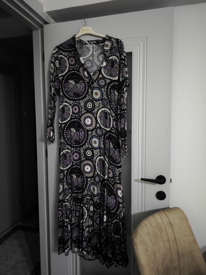 Instagramdan alındı iade edemedik o yüzden hiç kullanılmadı Uzun, bol kesim elbise, koyu mor desenli, uzun kollu ve V yaka. Düğmeli detaylı, yumuşak sentetik kumaştan yapılmıştır. Günlük kullanıma uygun.