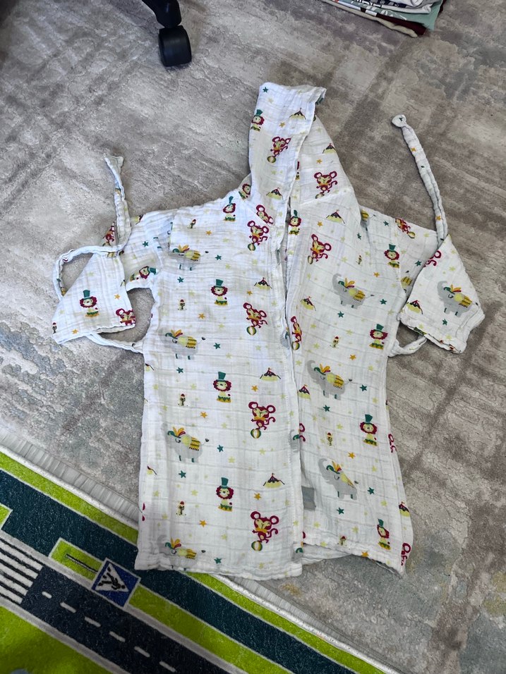 Desenli, uzun kollu ve bol kesim müslin bornoz Askısız yaka ve midi boy, beyaz ve gri renklerde. Hiç kullanılmadı.