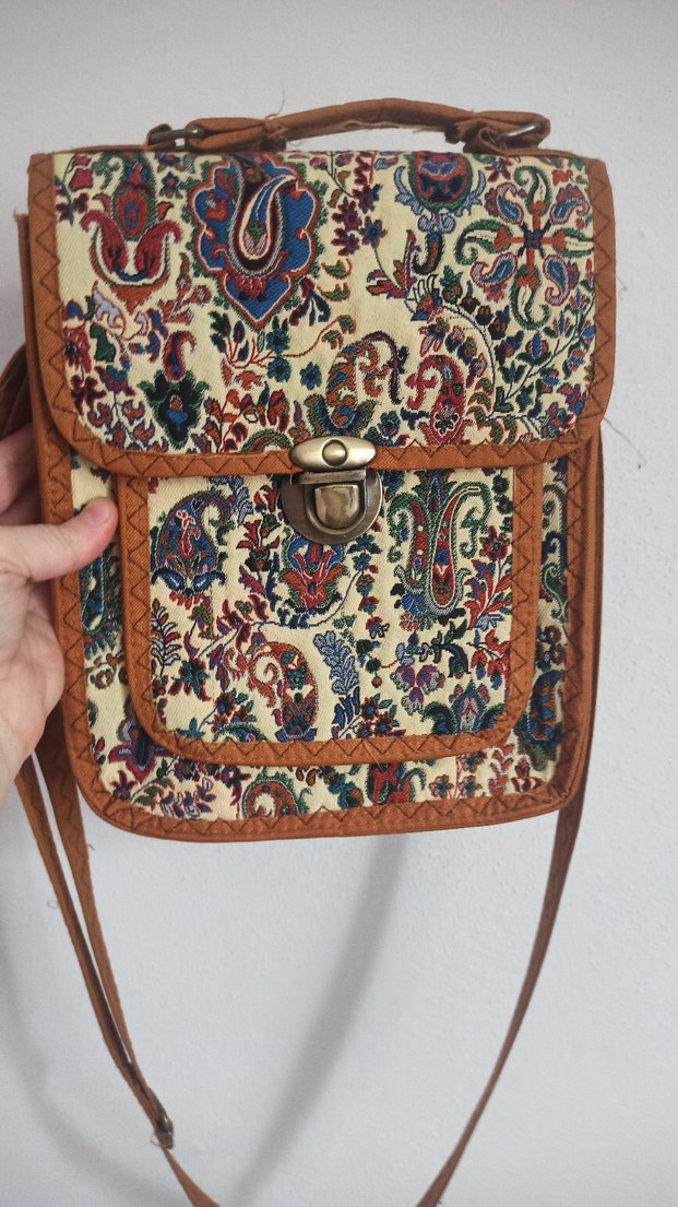 Bohem tarzda kadın çanta, çok renkli desenli kumaş ve kahverengi nakış detaylarla, tokalı kapaklı ve ince askılıdır.