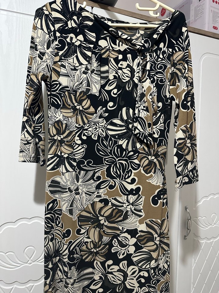 Normal yaka, uzun kollu, drapeli ve desenli koyu kahverengi elbise. Midi boy, ofis kullanımı için uygun.
