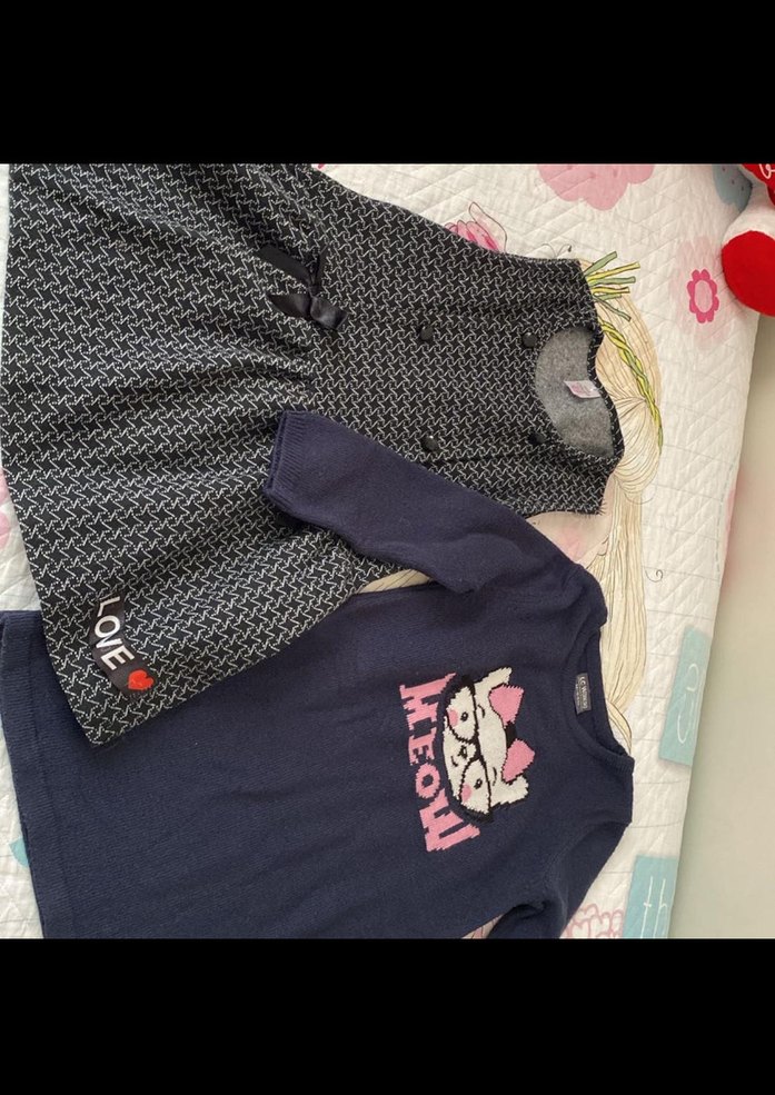 Desenli, örgü kedi kıyafeti, koyu gri renkte, sokak stili. Kedi temalı baskılı elbise ve kazak içerir. İki elbise hiçbir deformasyon yoktur. 4/5/6 yaşa uyumlu.