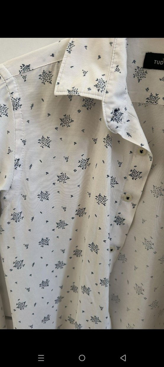 Pamuklu, beyaz zemin üzerine gri desenli, uzun kollu ve yakalı erkek gömleği. Rahat kesimi ve düğmeli önüyle günlük kullanıma uygundur.