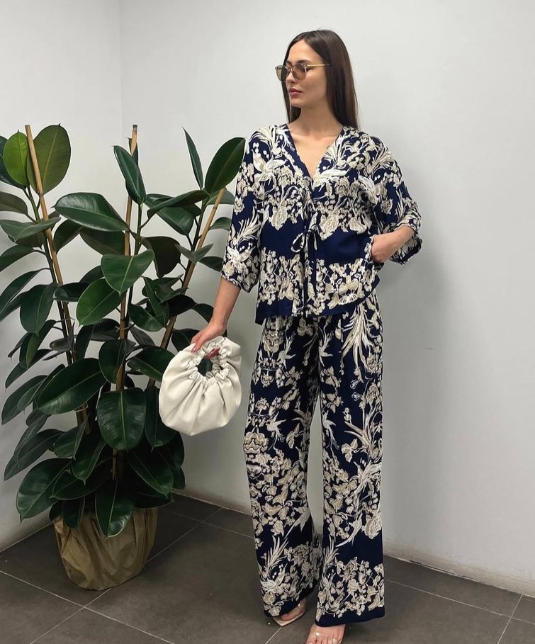 Açık lacivert desenli, bol kesim pantolon. Günlük kullanım için uygundur.