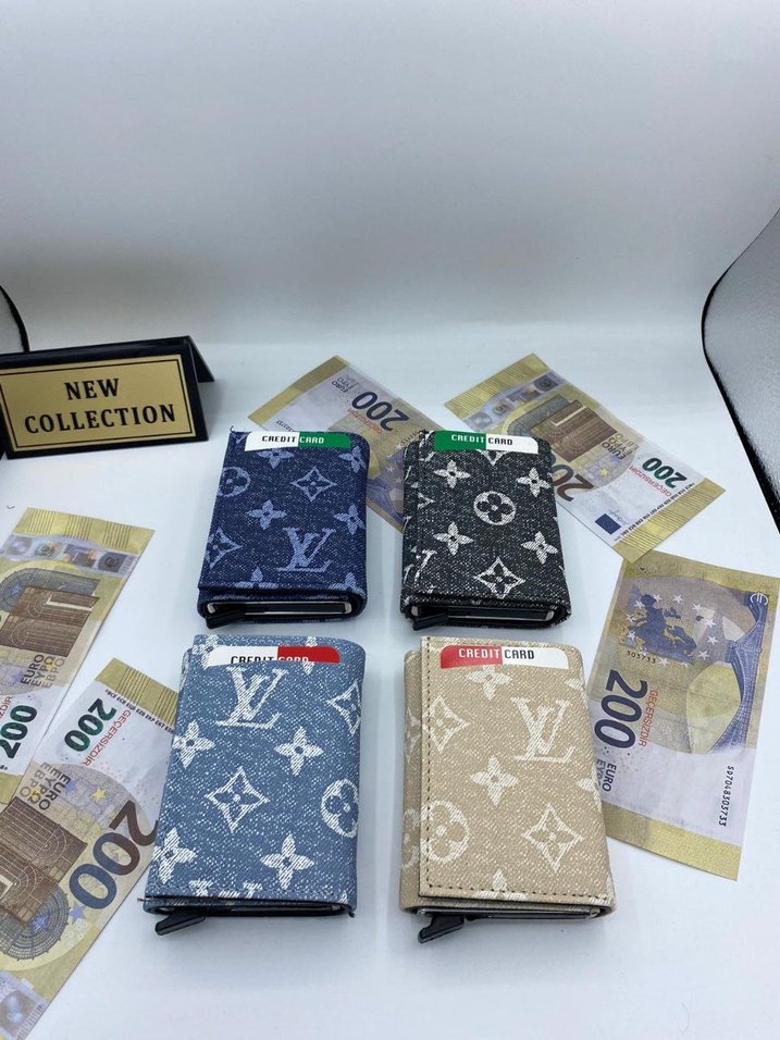 Açık mavi desenli, Parisli sokak stili erkek cüzdanı. Çoklu bölmeleri vardır. Üzerinde 'NEW COLLECTION' yazısı bulunur.