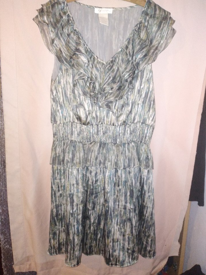 Gri, beyaz ve yeşil renkli desenlere sahip , pilili ve kolsuz elbise. V yaka ve beli lastikli, bol kesim ile rahat bir tarz sunar. Ofis kullanımı için uygundur.
